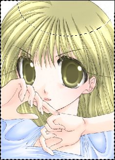 淡い光の上に、強い光の天使の輪を作成します。 円形の範囲選択ツールで、彼女の頭頂をカッパ状態に切り取るがの如く選択し、それを反転させますと左のような範囲が選択されます。 変な倍率でキャプチャしたら荒くなっちゃった…… |