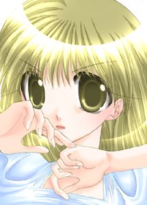 選択範囲のふちを大きなペンでなぞるようにして、天使の輪を描き入れます。 勿論これもキラキラ輝く覆い焼き。 下の方の髪にも薄く、同じ処理を施しました。 |
