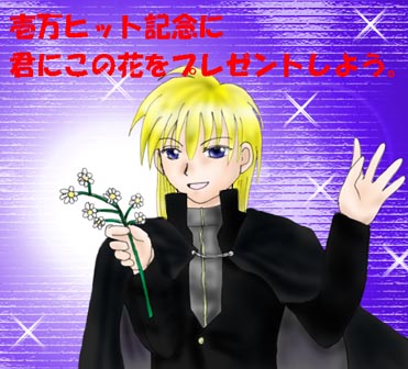 きなこさんから10000HITのお祝いにいただいた、FE聖戦のアレスです。 薔薇の似合う彼ですが、今回は特別に、貧乏草を持って登場していただきました。 まぁ、実際貧乏だしこっちも似合うといえば似合……(禁句)。 今回もキラキラチックな美しいイラスト(本人は足りないと言っておられましたが十分だと思ふ)、 ありがとうございました♪