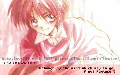 日鵺祭さんからいただいた、FF5のバッツですぅぅ!! こいつはすごいです。ええほんとに。 うきゃあぁぁぁ……ああ……もぉなんていうか……お姉さんよだれが止まりません(爆)。 ああ何という美しさでしょう。本当に私などが頂いてよろしいのでしょうか。 本当にさいさんは並みの絵描きさんではないです。ほんとすごいお方です。 私もこのレベルに少しでも近づけるよう頑張んなきゃ駄目ですね(無・理♪)。
