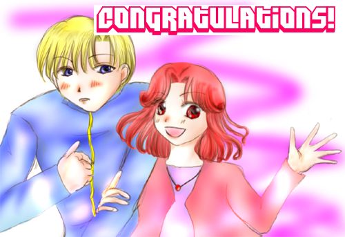 きなこさんより50000HIT記念(でいいのかな?)で頂きました、当サイトの小説「Crusade」のディルト王子とリタ姫です。 きなこさんにはいつもいろいろ頂いてばっかりで……(涙)。ほんと、東京に足向けて眠れません。 元気な笑顔を見せるリタ様と何だか照れてるディルト様。ああ〜。ラブぅー♪ いいです。こんな青春真っ盛りラブ。全世界の女の子たちの夢ですね。輝いてます。 きなこさん。ありがとうございました〜。愛してます〜(やめれ)。