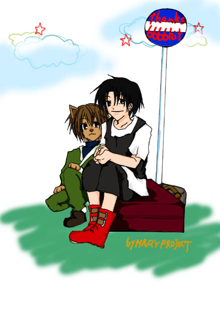 6666HITのリクイラ、オリジナル小説BLIGHTNESS DARKNESSの主人公サキちゃんと わんわん忍者(こら)ナナマルちゃんです。いやぁん〜ラブリーすぎ!! ナナマルちゃんがー!!(大興奮) 平和そうな優しい表情を浮かべている二人がいいです〜。月里さん、日光さんありがとうございました〜♪
