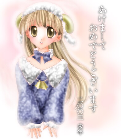 2003年用お年賀イラスト。クリスマスがイラスト書いてる場合じゃなかったので、年賀状にずれ込みました。 クリスマスはクリスマスで書きたい図案があったのになあ。くそぅくそぅ。 そして描いたイラストはフォロー不可能だし(笑)。なんでコスプレー!!(爆) 頭のアレですが自分的にはヘッドドレスって感じ(←?)に描いたつもりが普通に帽子に見えて、むー。な感じ。
