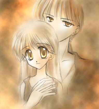 トップ絵リクエストで、ウィルとソフィアのラブラブをリクエスト頂いたとき、真っ先に思いついたのがこんな感じ。 いくらなんでもこれでトップは恥ずかしかったので、トップ絵は別なの描きます。 ちなみに今回のテーマは覆い焼きツールと焼き込みツールを使ってみよう、でした。 初めて使いました。で、背景に直接それ使って濃淡入れました。はい、手抜きです。