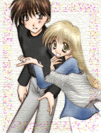 トップ絵リクエスト第四弾。緋月湊さんからリク頂きました「ウィルとソフィアのラブラブ」(笑)。 恥ずかしかったから描き直したって割には……何か余計恥ずかしい〜。きゃー(何故)。 多分いけなかったのはピンクのつぶつぶ……でもこれがないと画面寂しかったのですね。 タイトル……「おかいもの」。買い出しか何かで外に出て、たかり放題たかってるんでしょう。 男は女の子にたかられて一人前になるんだよ〜(嘘こけ)。