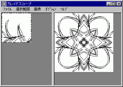 お手持ちの画像やでたらめならくがきを万華鏡を覗いたような図案に変換して出力します。